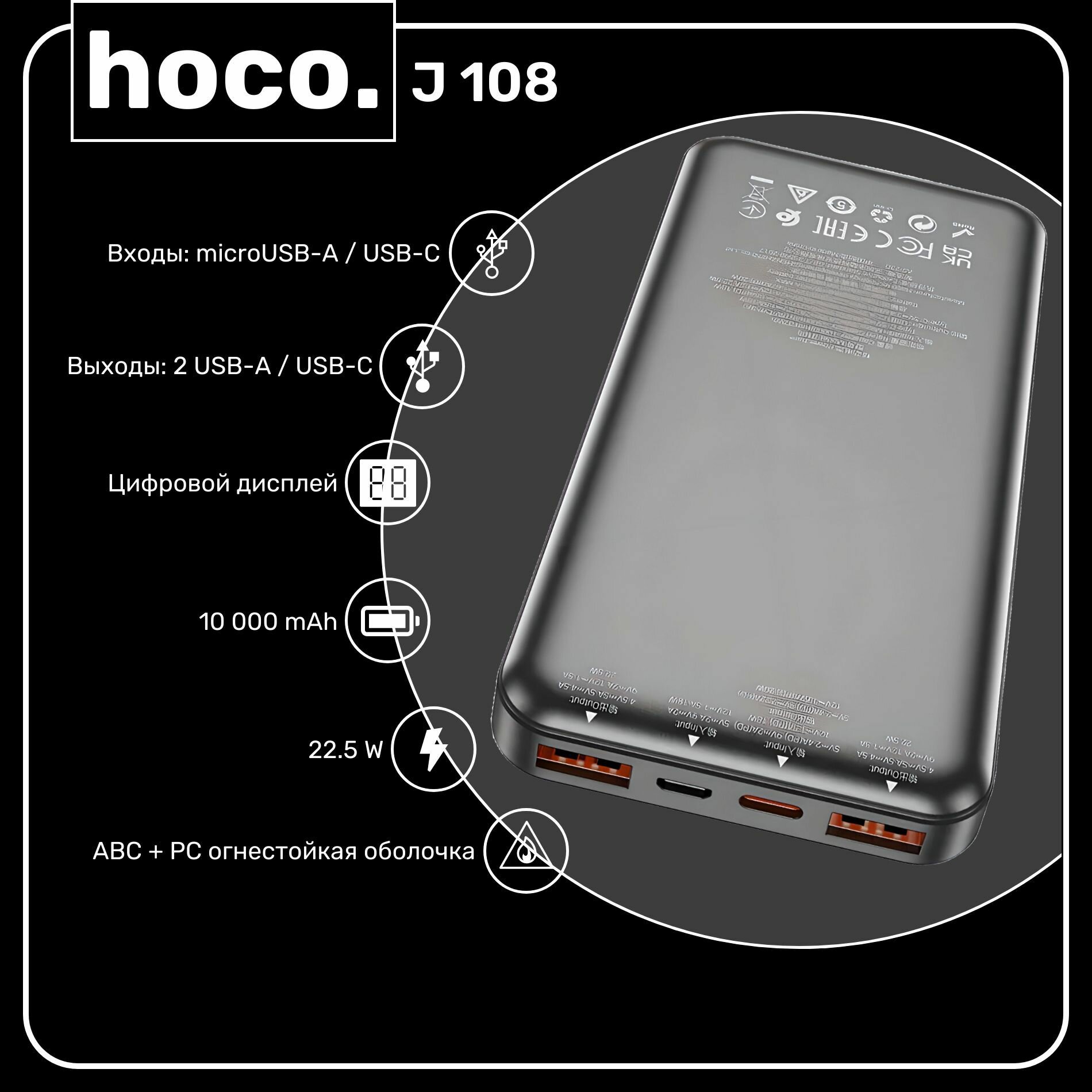 Купить Портативный аккумулятор HOCO J108 Universe, 3A, 10000 мА⋅ч, черный