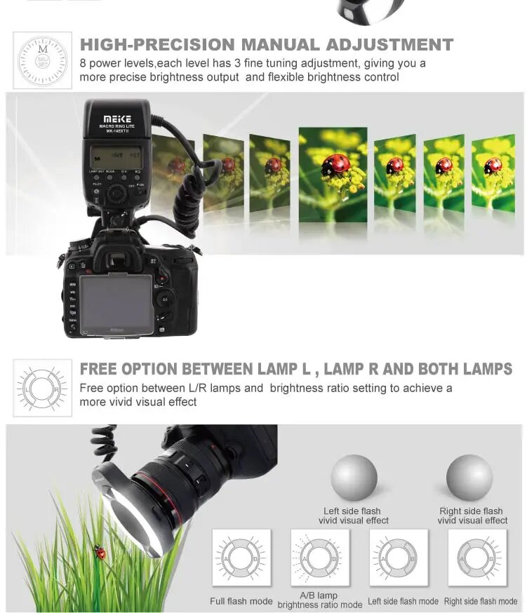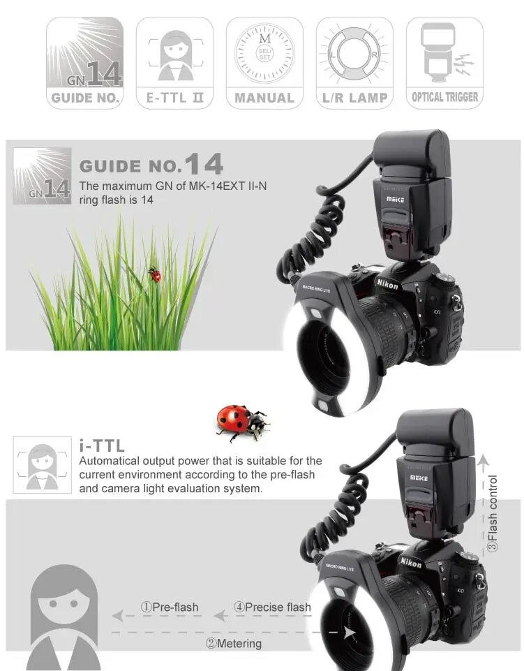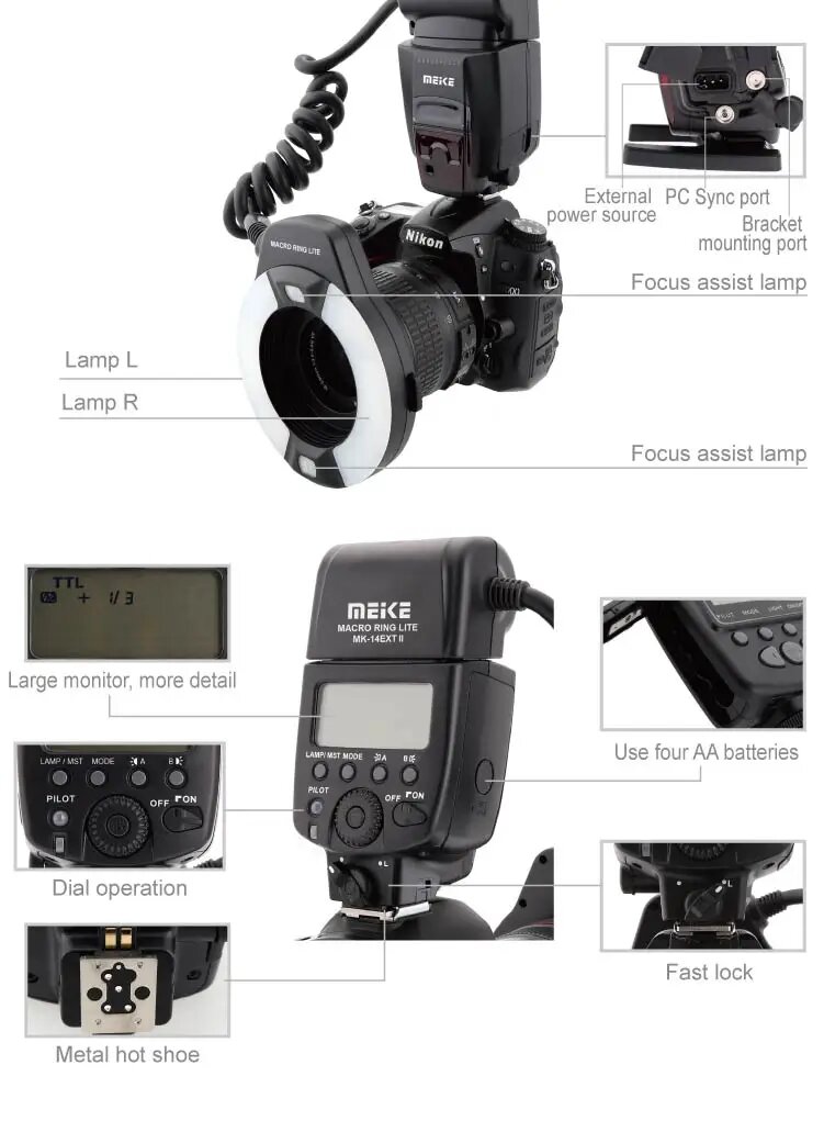 Купить Кольцевая вспышка Meike MK-14EXT i-TL для камеры Nikon D850 D7500 D810 D80 D800 D90 D5 D600 со светодиодной вспомогательной лампой AF