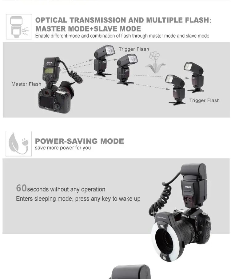 Кольцевая вспышка Meike MK-14EXT i-TL для камеры Nikon D850 D7500 D810 D80 D800 D90 D5 D600 со светодиодной вспомогательной лампой AF интересное: