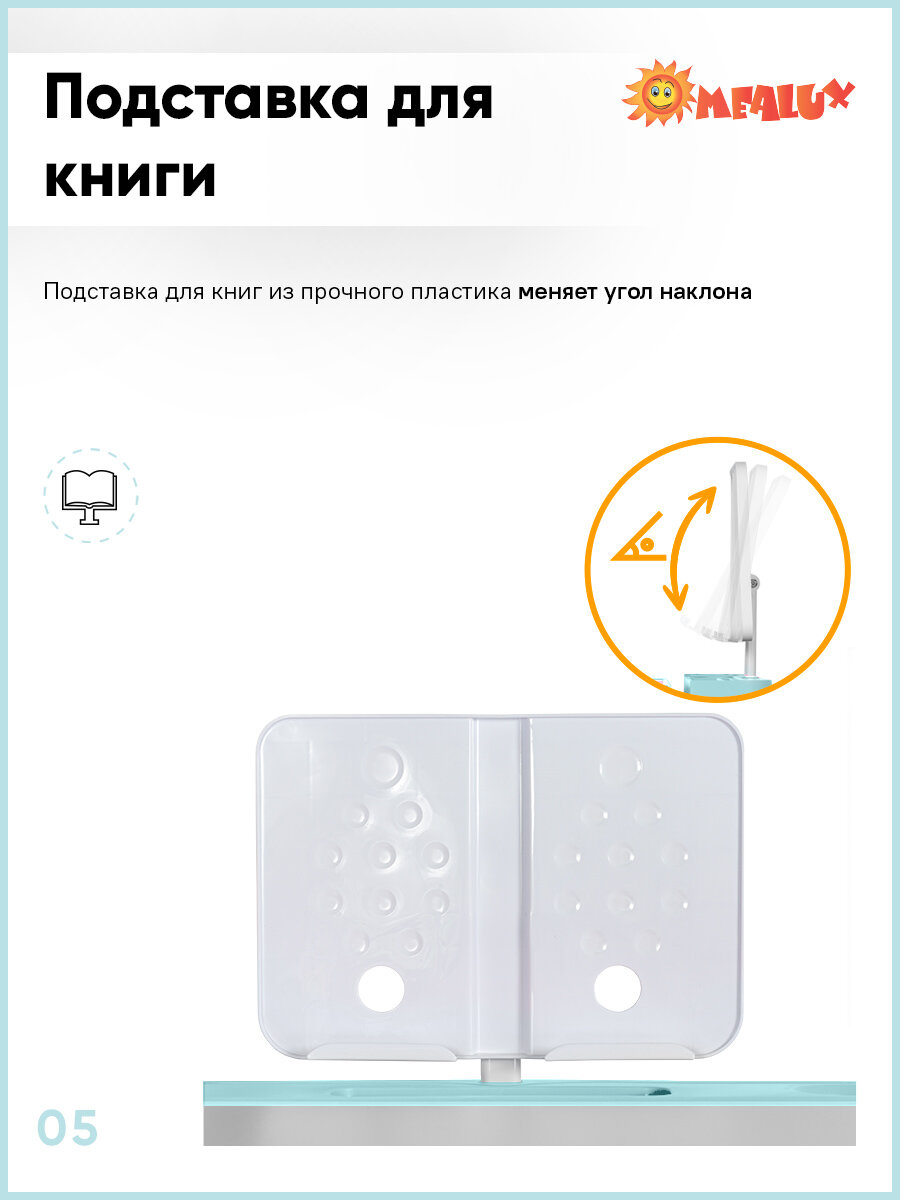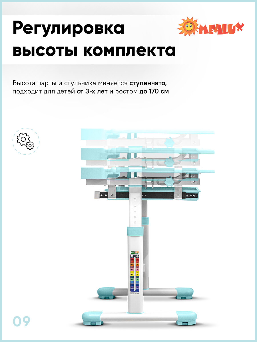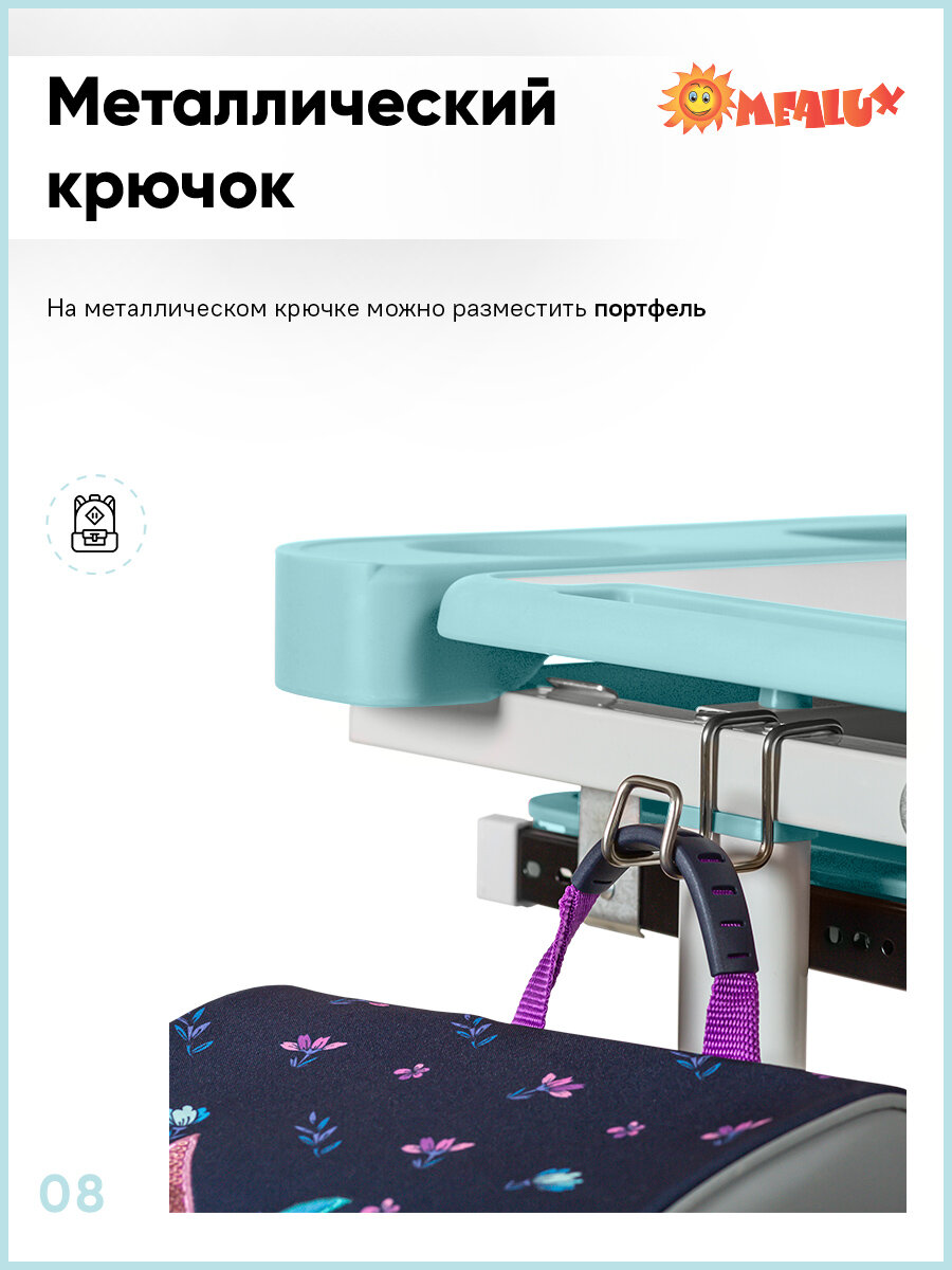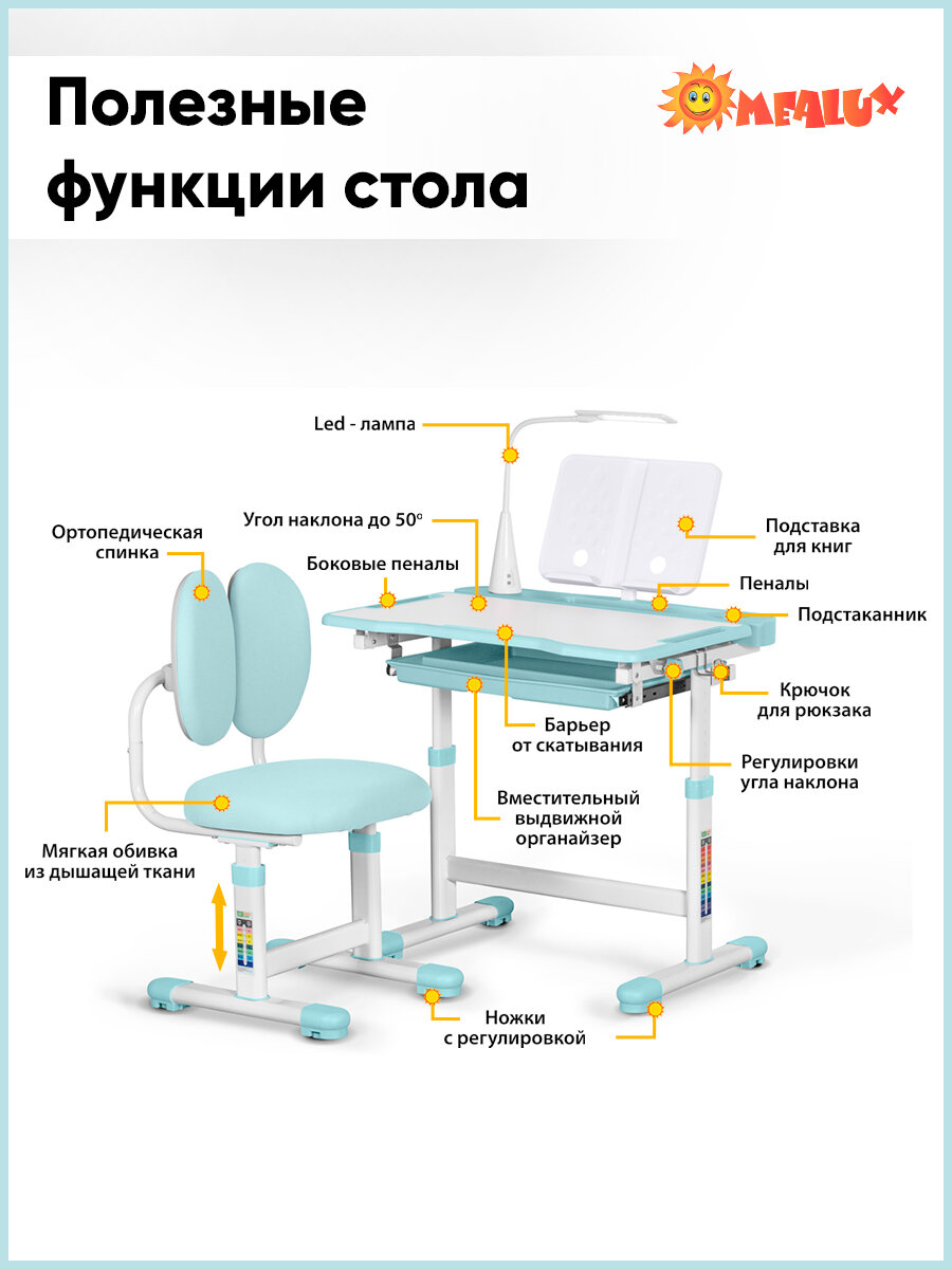 | Комплектация | подставка для книг; LED лампа; металлический крючок для рюкзака; детская растущая парта; детский растущий стул |