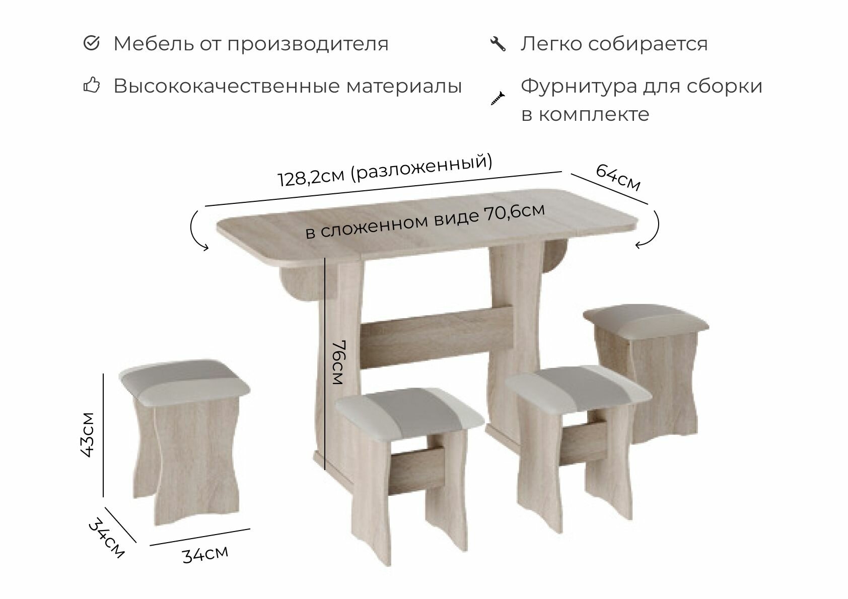 | Комплектация | Стол - 1шт., табурет - 4шт., фурнитура, паспорт изделия |