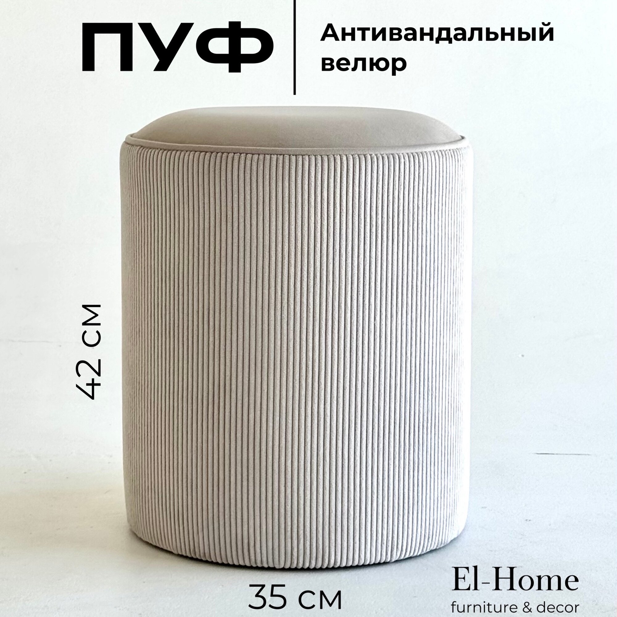 Пуф El-Home, велюр, круглый, 42х35х35см, антивандальная обивка, ножки, серо-бежевый