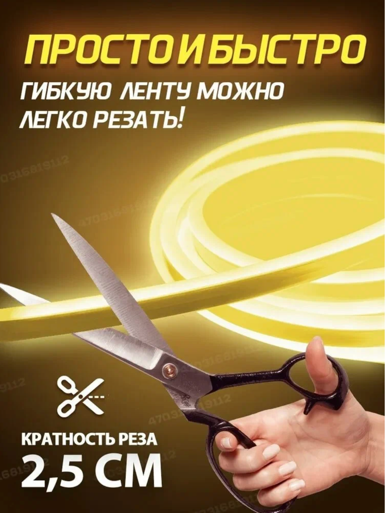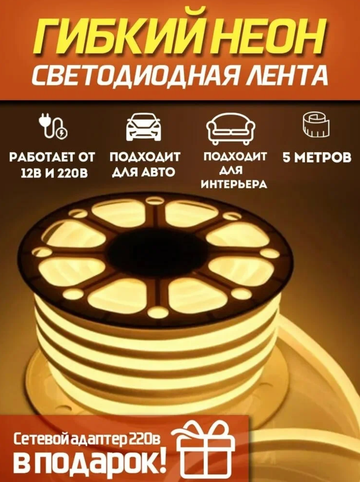 Светодиодная лента 5м, 220В, IP67, 120 LED/m Гибкий неон 5 метров, неоновая RGB лента, подсветка интерьера/ Теплый белый / AZ Shop