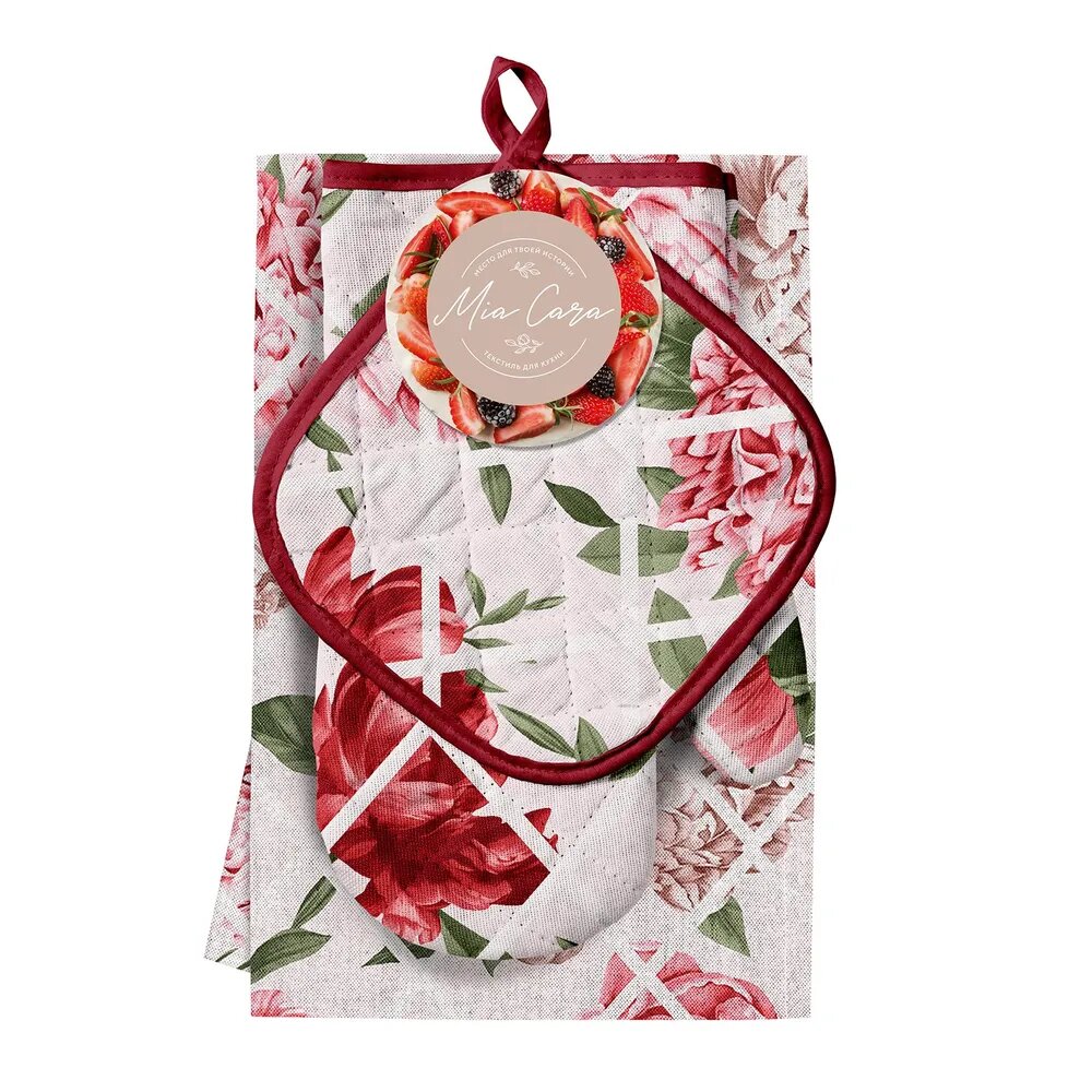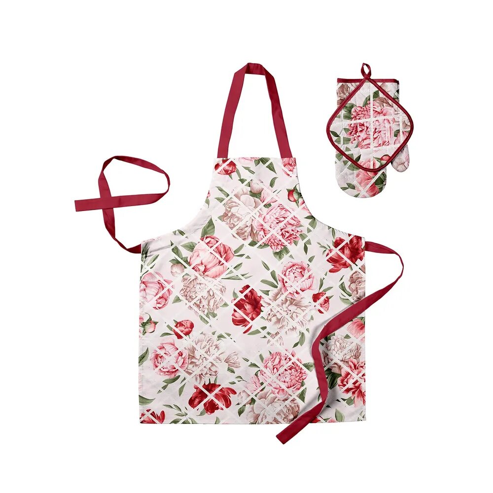 Подарочный набор прихватки для кухни (прихватка 18х18, прихватка-рукавица,18х28, фартук 60х70) "Mia Cara" рис 14057-1 Душистый пион