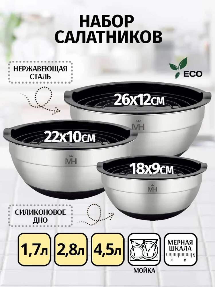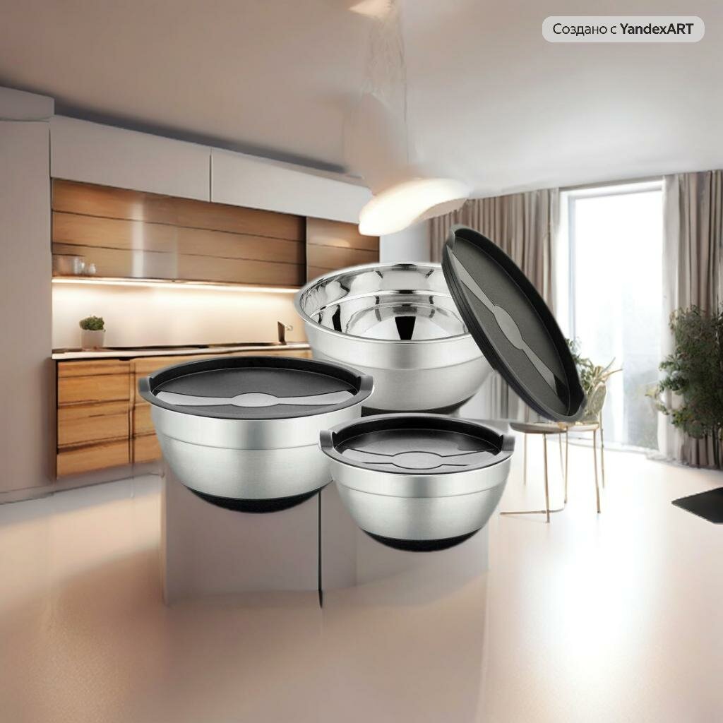 MercuryHaus / Набор мисок из нержавеющей стали / Миски с крышками. 3 шт / Салатник с крышкой/ Миска