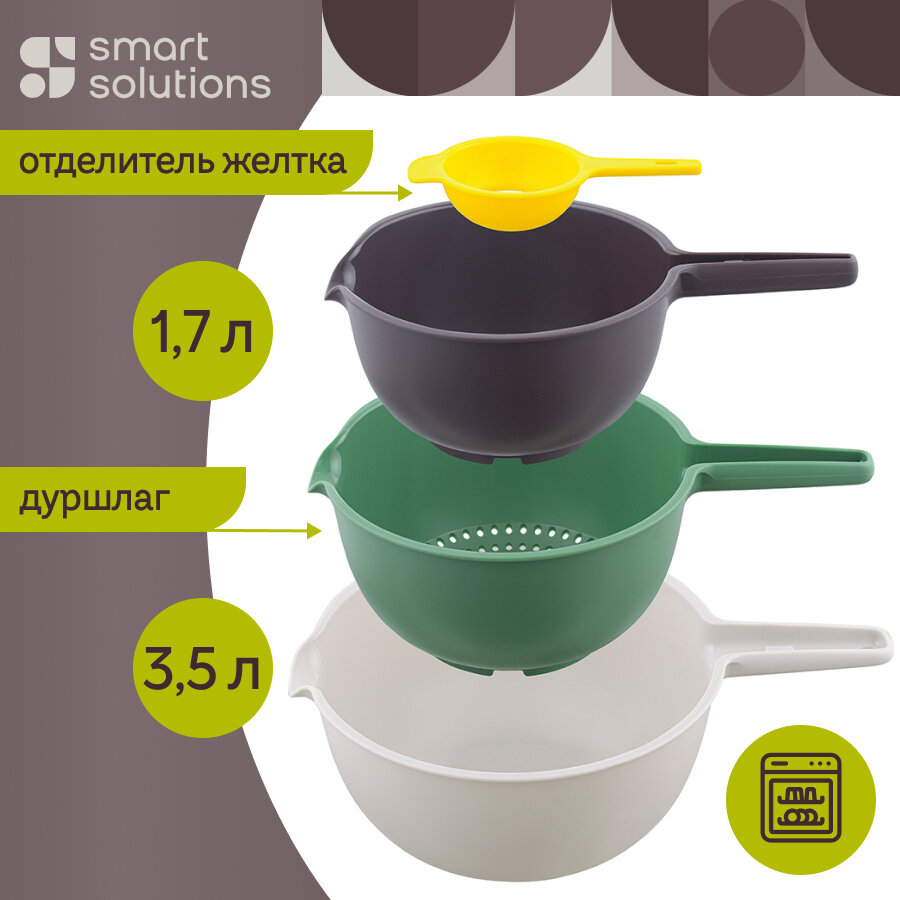 Купить Набор из 4 штук Миска Smart Solutions Trym 37x25.3x13.5см, 34x23x12см, 31x20.7x10.8см, отделитель желтка 14.8x7.9x3см, полипропилен