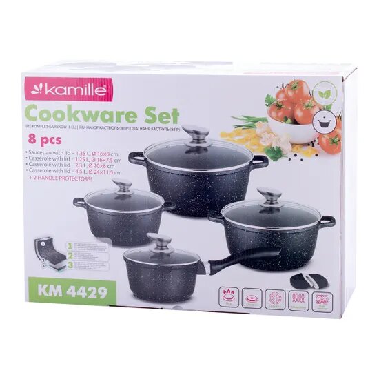 Ниже Вы можете прочитать отзывы на Набор посуды 9 предметов из литого алюминия Kamille KM-4429 (3 кастрюли, ковш, прихватки) с мраморным покрытием (черный), ознакомится с подробными характеристиками, посмотреть интересные обзоры и фотографии на Набор посуды 9 предметов из литого алюминия Kamille KM-4429 (3 кастрюли, ковш, прихватки) с мраморным покрытием (черный).