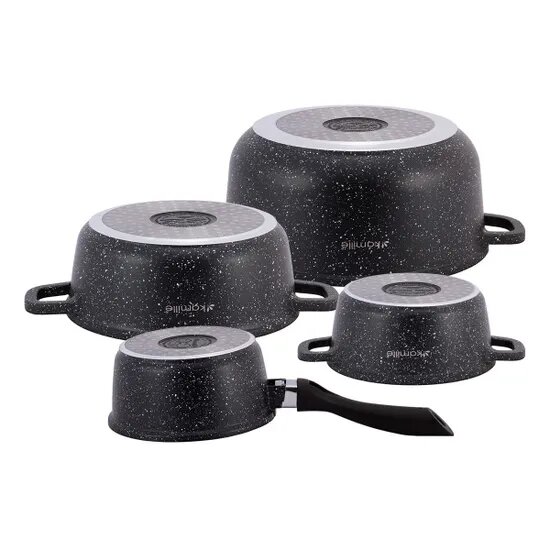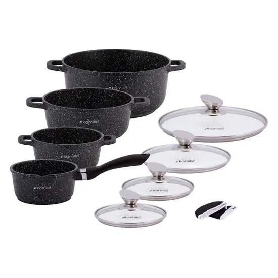 Купить Набор посуды 9 предметов из литого алюминия Kamille KM-4429 (3 кастрюли, ковш, прихватки) с мраморным покрытием (черный)