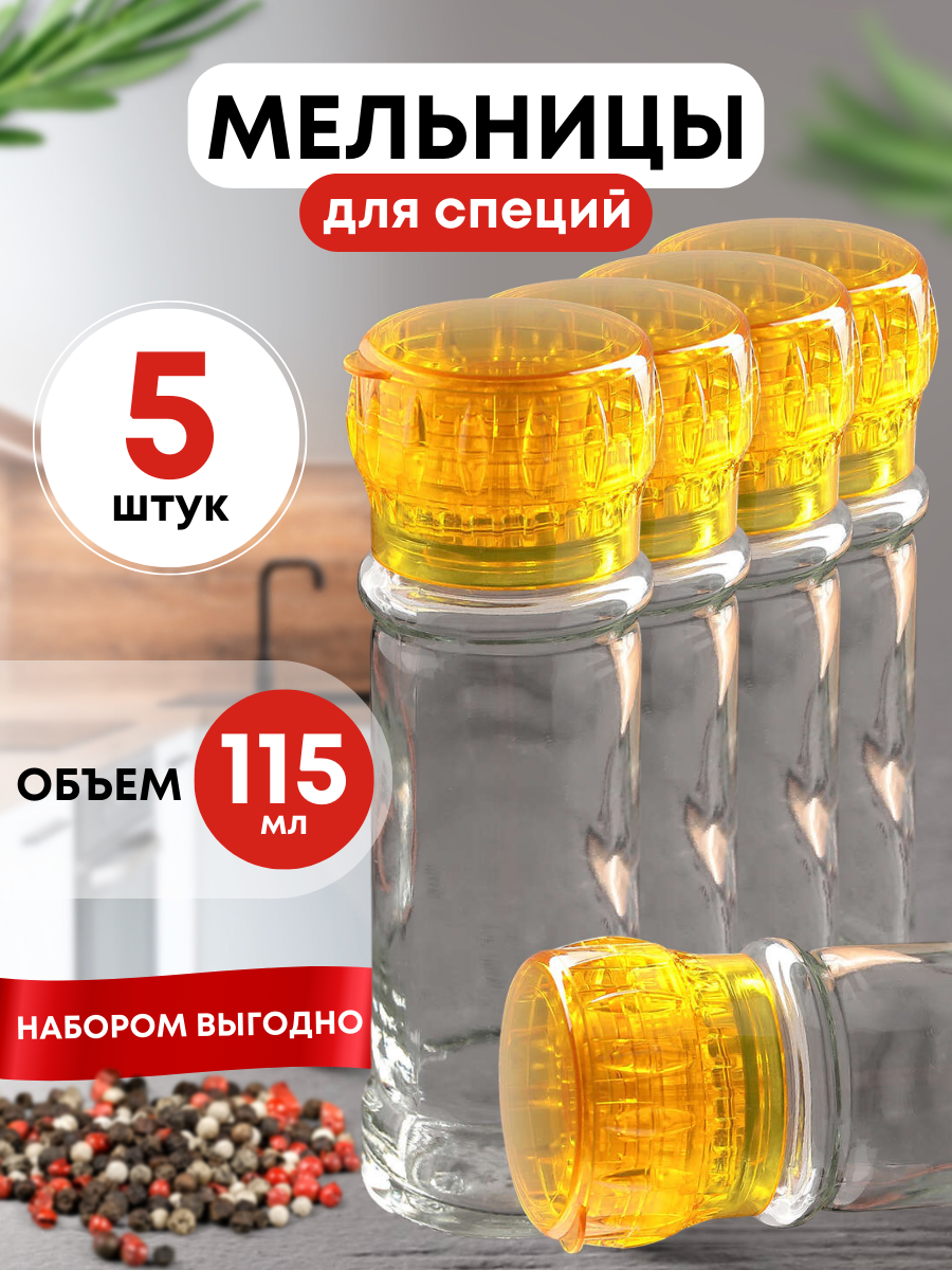 Купить Мельницы желтые многоразовые стеклянные для перца и соли 5шт