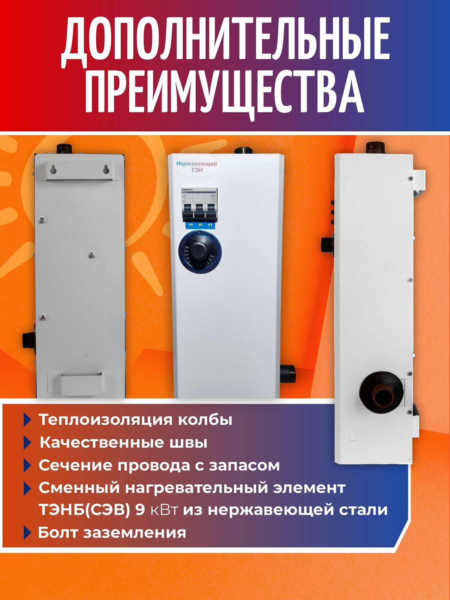 Электрический котел отопления, электрокотел ЭВПМ 9 кВт., 380В. с ТЭН из нержавеющей стали, на автоматах интересное: