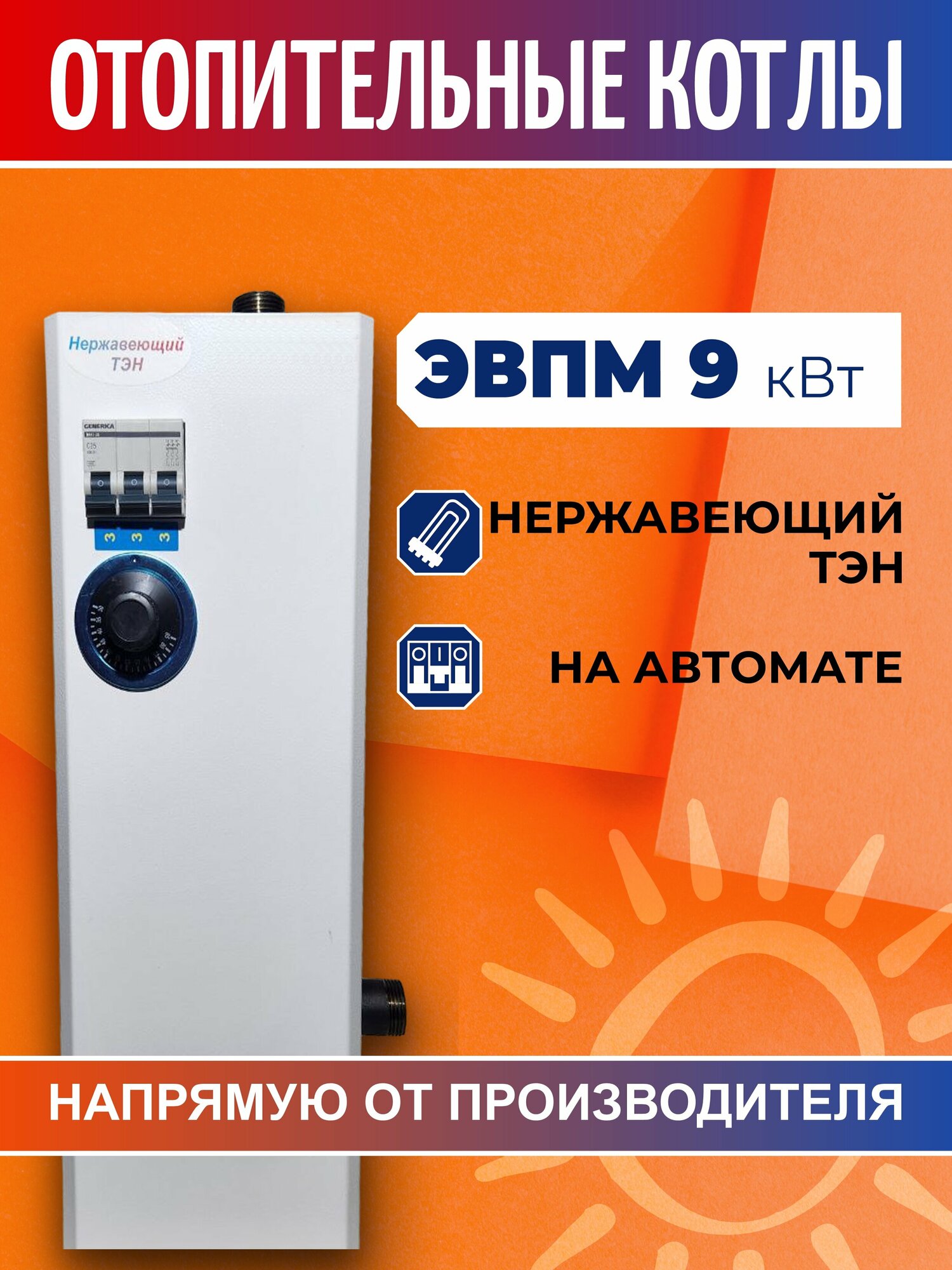 Купить Электрический котел отопления, электрокотел ЭВПМ 9 кВт., 380В. с ТЭН из нержавеющей стали, на автоматах