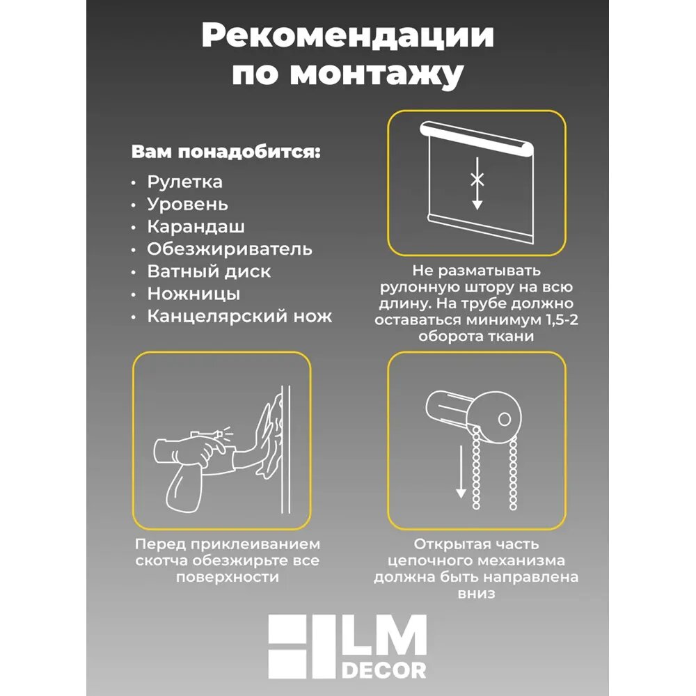 | Комплектация | Рулонная штора на стальном оцинкованном валу 17 мм - 1 шт, утяжелитель пластиковый вшитый - 1шт, боковые кронштейны - 2шт, регулировочные кронштейны на откидную створку - 2 шт, площадки на двустороннем скотче для глухой и откидной створки окна - 2 шт, механизм управления на цепи 1 шт, ограничитель управления цепи - 1 шт, этикетка и инструкция - 1 шт. |