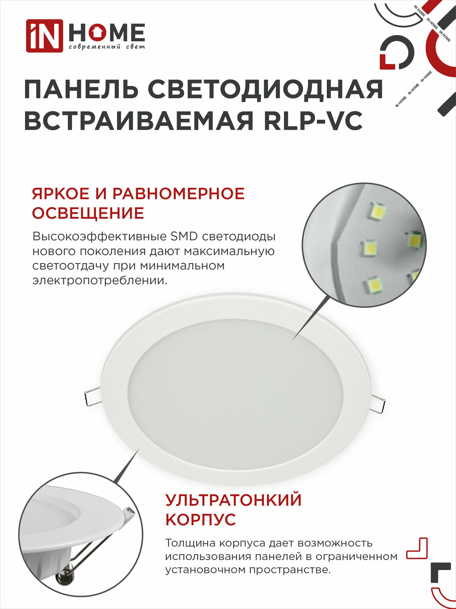 IN HOME Панель сд встраиваемая круглая RLP-VC 18Вт 230В 6500К 1440Лм 185мм белая IP40 (арт. 4690612024547)