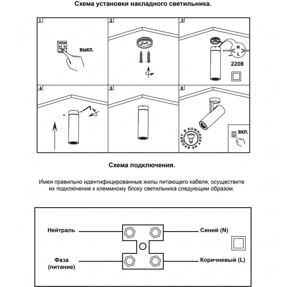 | Дополнительная информация | угол рассеивания 180°, угол поворота светильника 350°, направленный свет, подходит для натяжных потолков, способ крепления - на скобу |