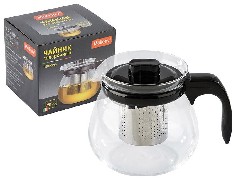 | Комплектация | Чайник заварочный Mallony Persona, из жаропрочного стекла, с фильтром из нержавеющей стали, ручка из пластмассы |