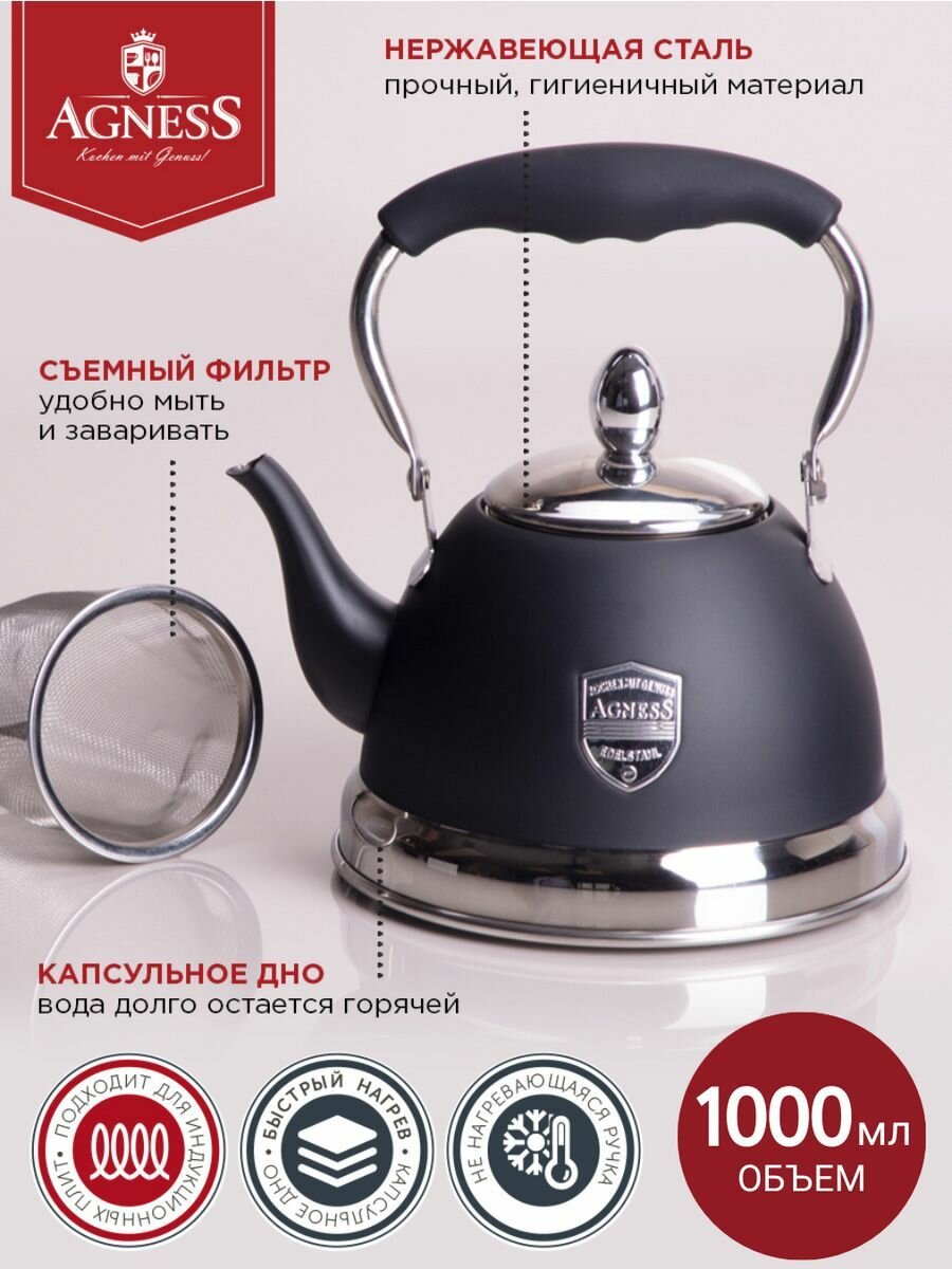 Чайник Agness с фильтром, 1 л индукционное капсульное дно и складывающейся ручкой