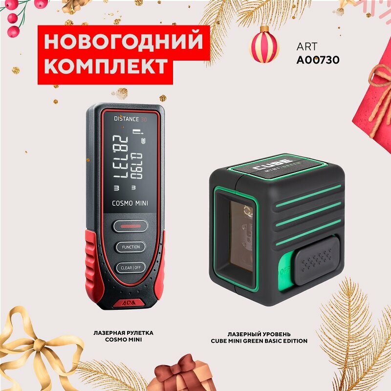 Новогодний Комплект Лазерный уровень ADA Cube Mini Green Basic Edition + Дальномер лазерный ADA Cosm .
