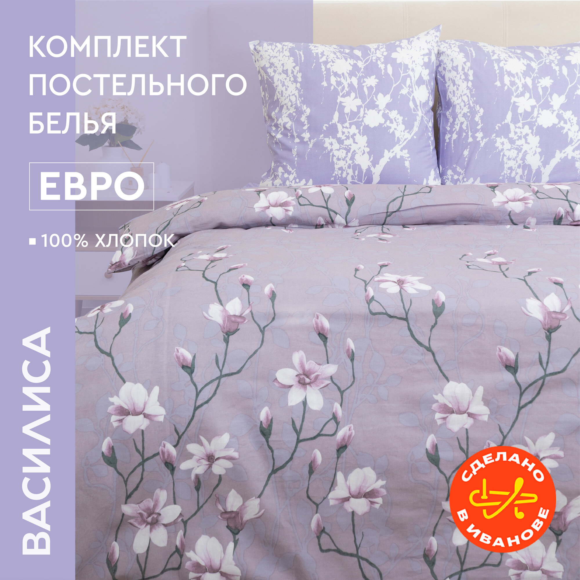 Постельное белье "Василиса" Евро, Бязь, Нежная магнолия