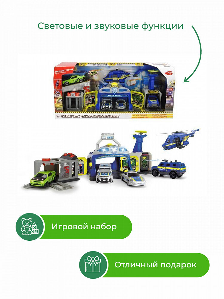 | Комплектация | 4 машины со свободным ходом: Dodge Hellcat Villian со светом, звуком, полицейские Porsche, Citroen, внедорожник с водой, 1 вертолет |