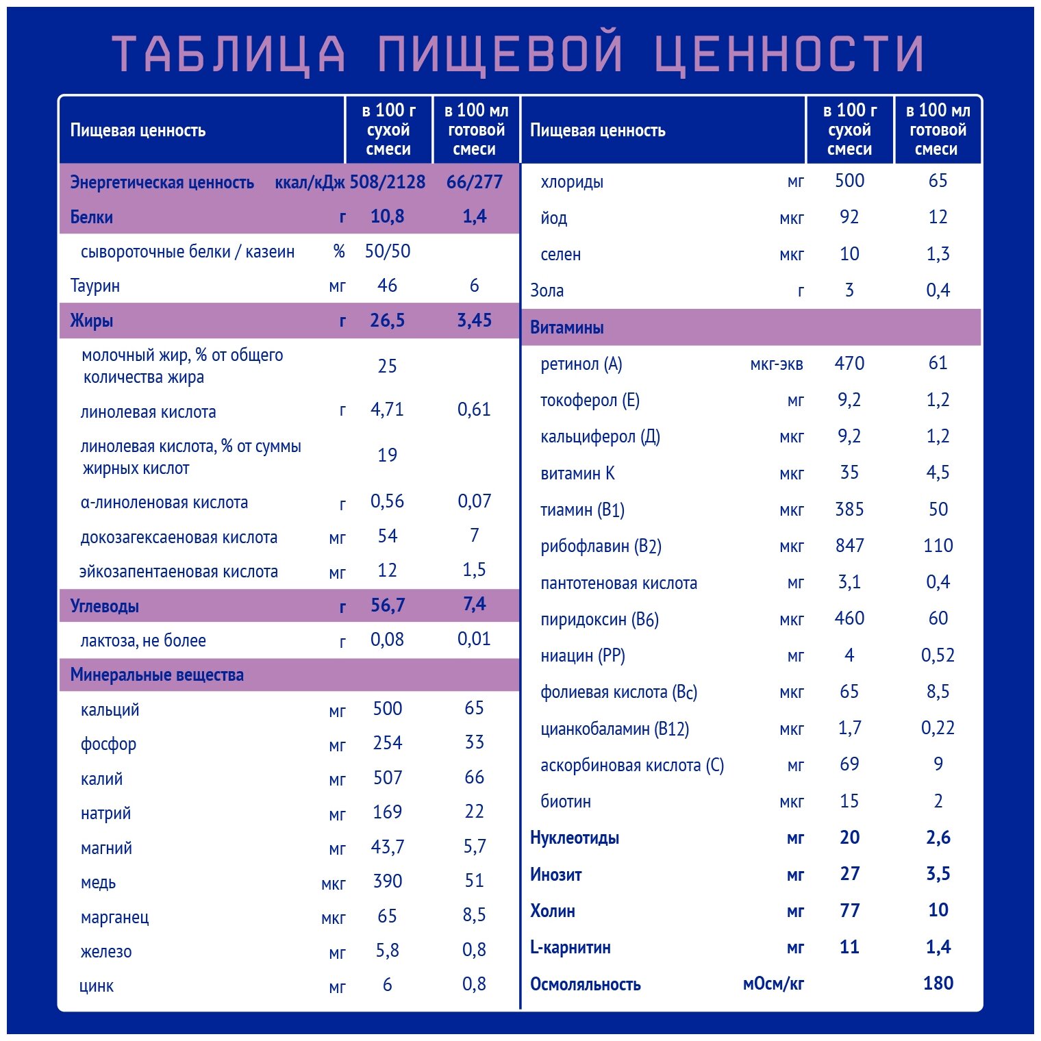 | Состав | глюкозный сироп, мальтодекстрин, растительные масла (подсолнечное высокоолеиновое, соевое, кокосовое), молочный белок, молочный жир, белок молочной сыворотки, минеральные вещества, рыбный жир (источник докозагексаеновой кислоты DHA и эйкозапентаеновой EPA кислот), витамины, холин битартрат, эмульгатор (лецитин), таурин, инозит, нуклеотиды (цитидин-5’-монофосфорная кислота, уридин-5’- монофосфат динатриевая соль, аденозин-5’-монофосфорная кислота, гуанозин-5’-монофосфат динатриевая соль, инозин-5’-монофосфат динатриевая соль), L-карнитин, антиокислитель (аскорбилпальмитат) |