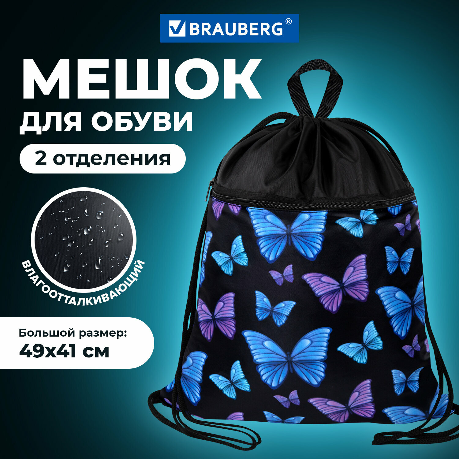 Мешок для обуви Brauberg Большой с ручкой карман на молнии сетка 49х41 см Fly aways 272402 .
