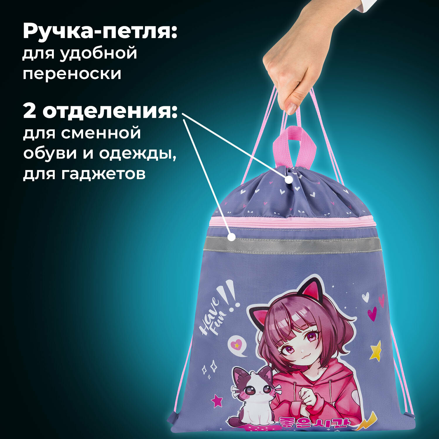 Мешок для обуви BRAUBERG, с петлей, светоотр. полоса, 2 отделения, 46х36 см, Anime friends, 272398