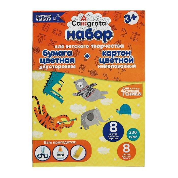 | Дополнительная информация | 8 листов цветного одностороннего немелованного картона плотностью 230 гр/м2, 8 листов цветной двусторонней бумаги |