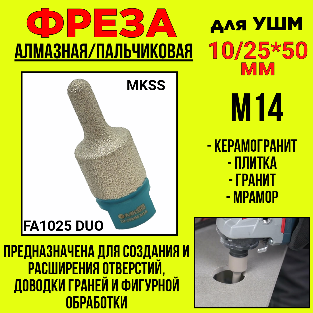 Фреза пальчиковая алмазная FA1025 DUO (10/25*50mm) M14 MKSS для УШМ
