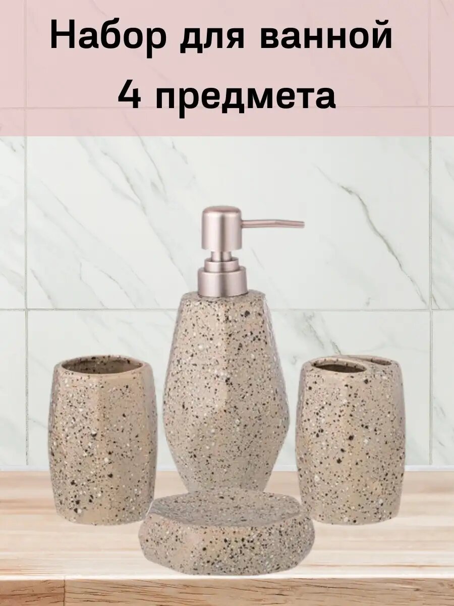 Набор для ванной комнаты 4 предмета: дозатор для жидкого мыла, подставка-стакан, подставка для зубных щёток и мыльница для кускового мыла.