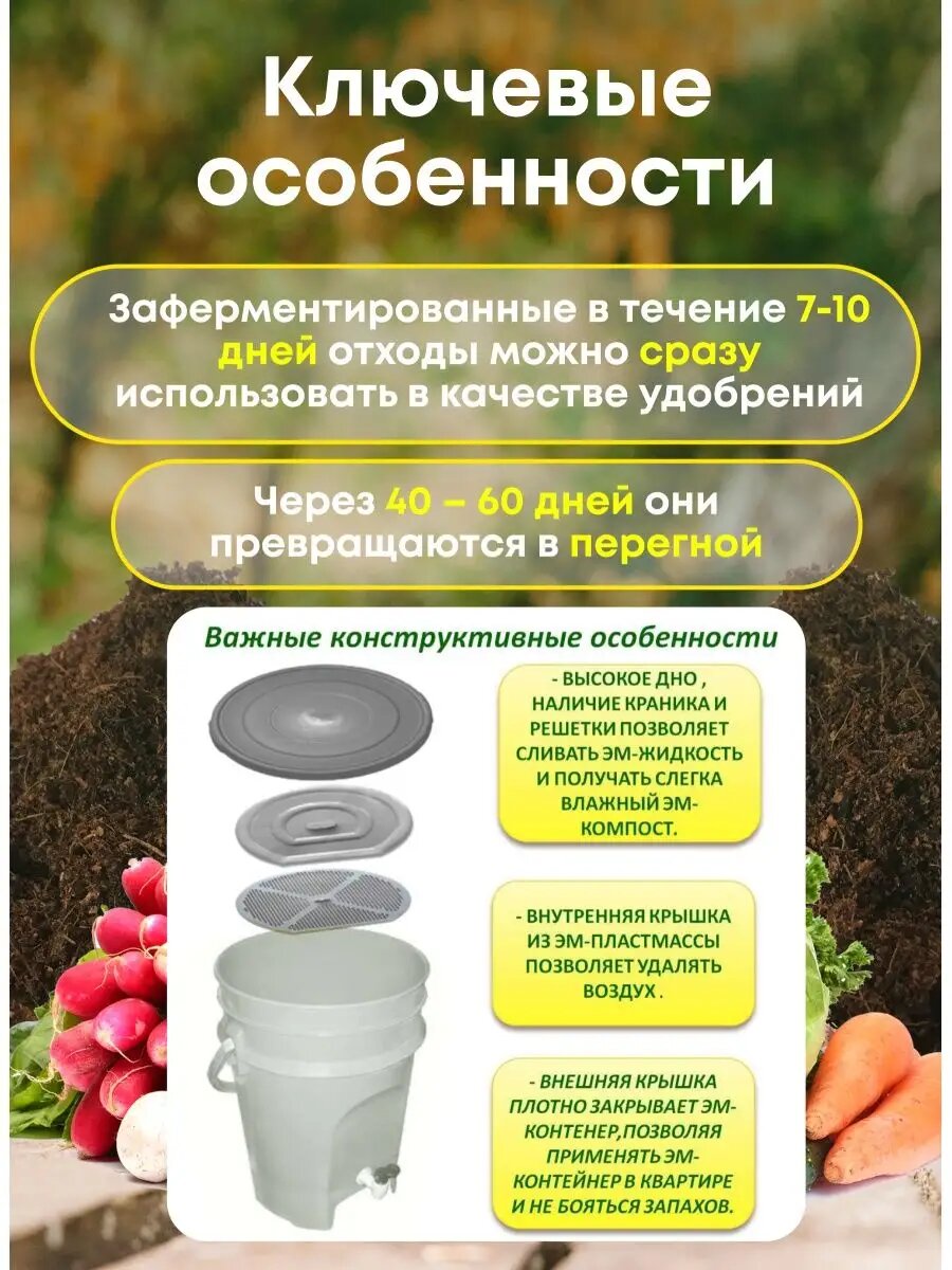 | Комплектация | Контейнер "ЭМ-пластмасса" для ферментации отходов 15л - 1шт |