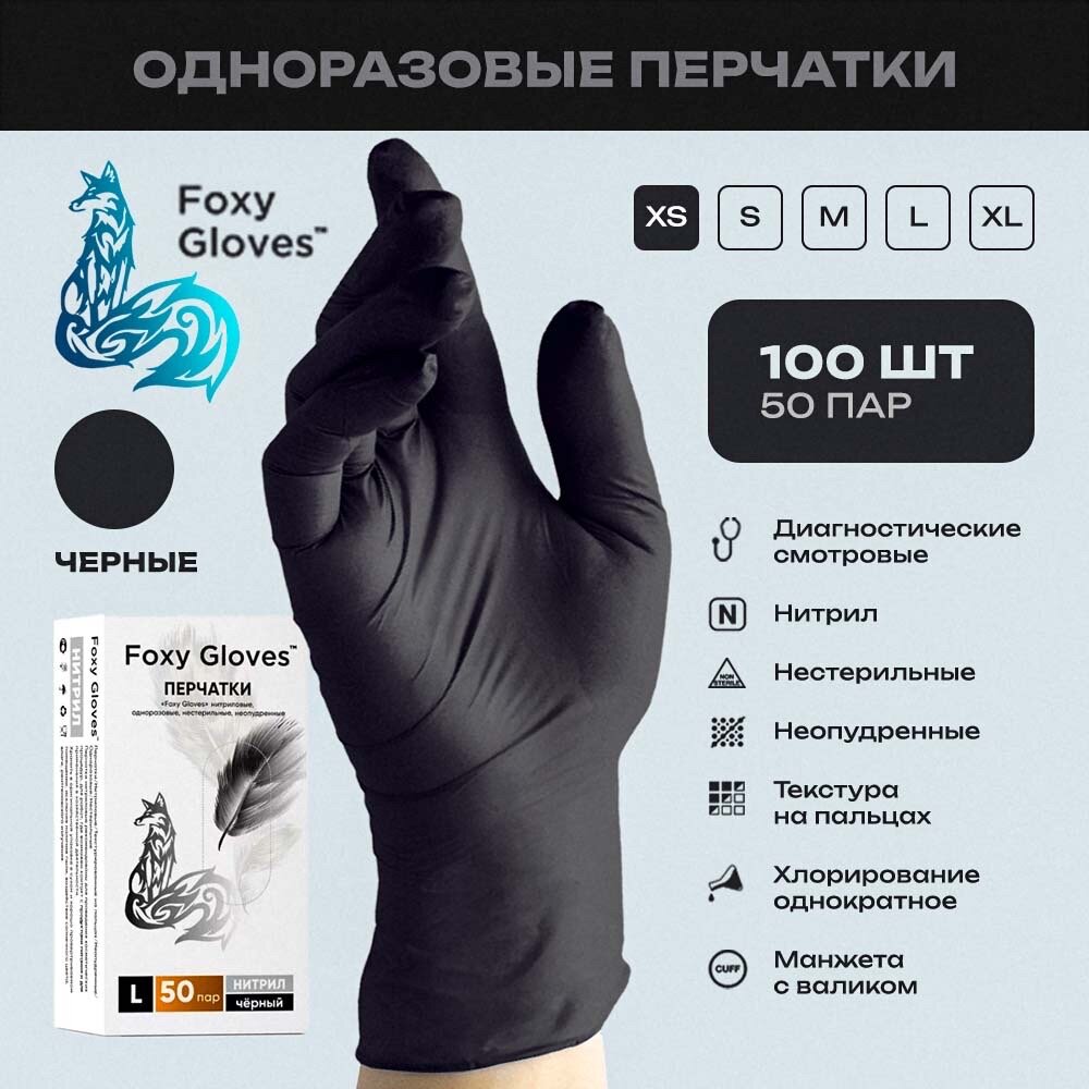 Перчатки "Foxy Gloves", размер L, Чёрные, 100шт (50 пар), нитриловые, одноразовые.