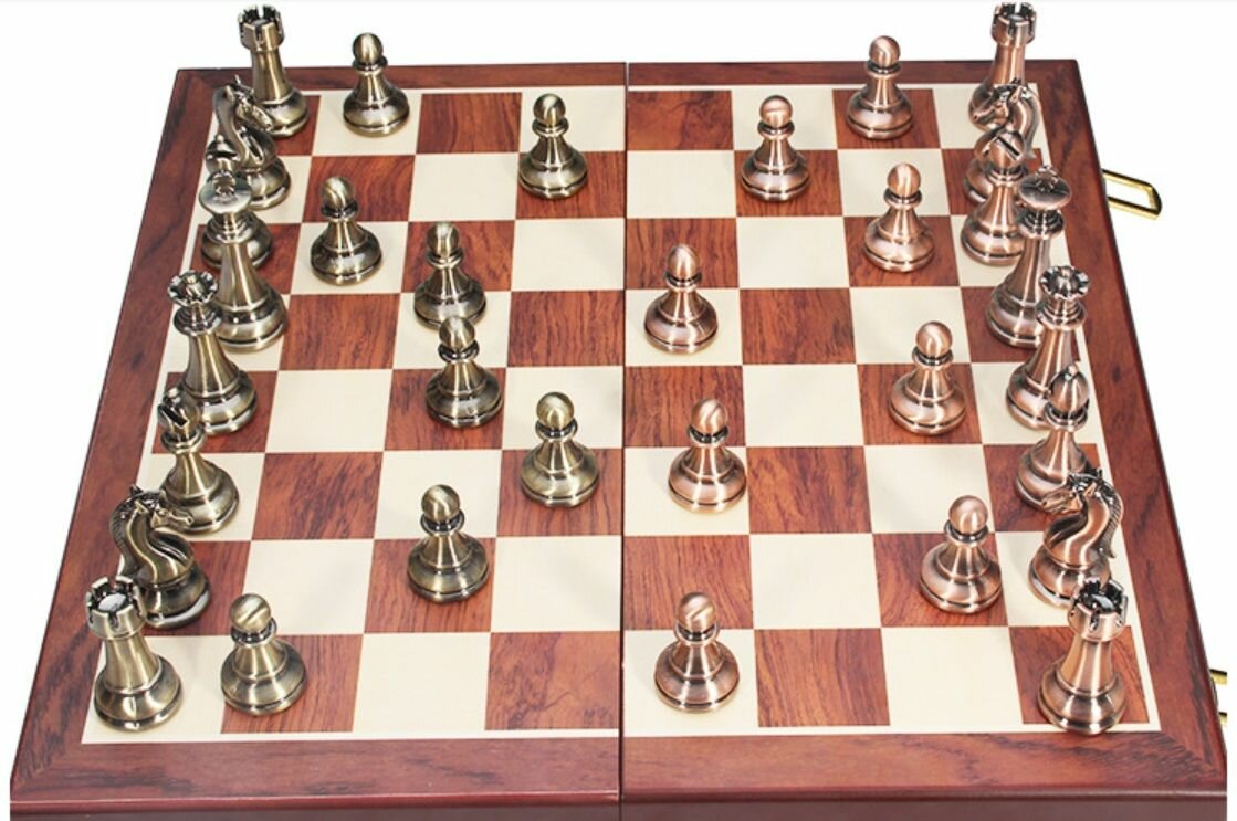 Подарочные шахматы. Металлические хромированные фигурки, деревянная доска (Размер 29x29 см). Позолоченный, серебряный стиль