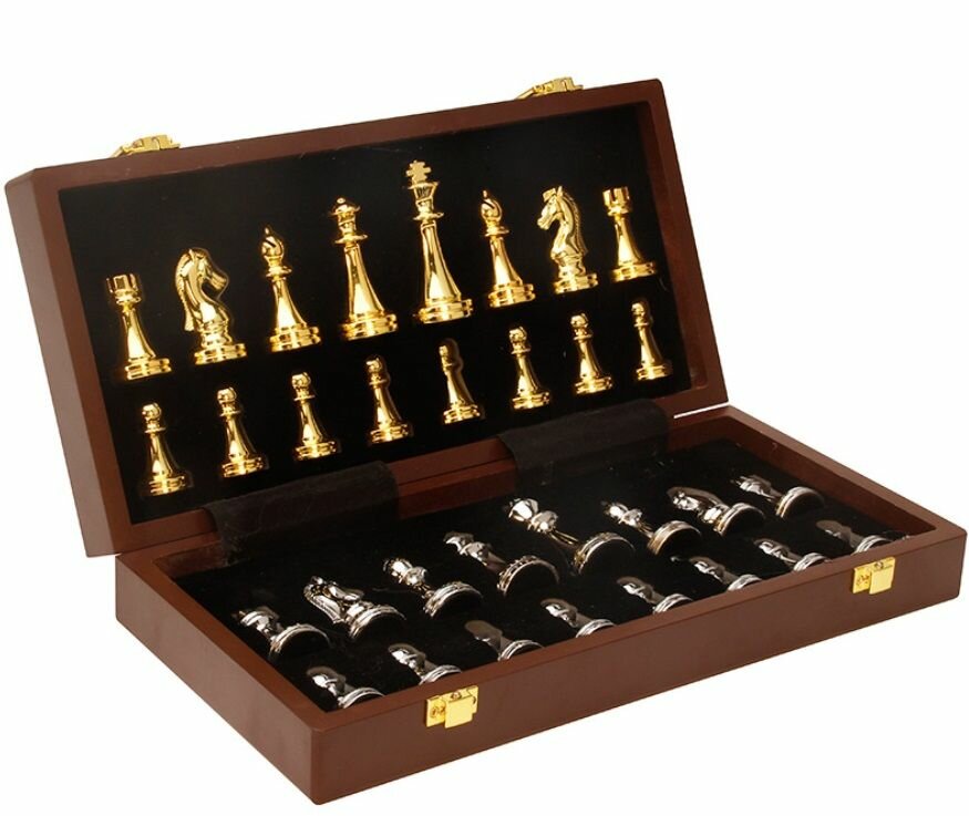 Купить Подарочные шахматы. Металлические хромированные фигурки, деревянная доска (Размер 29x29 см). Позолоченный, серебряный стиль