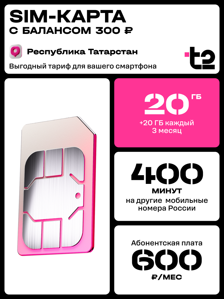 Купить Sim-карта t2 для Республики Татарстан, баланс 300 рублей