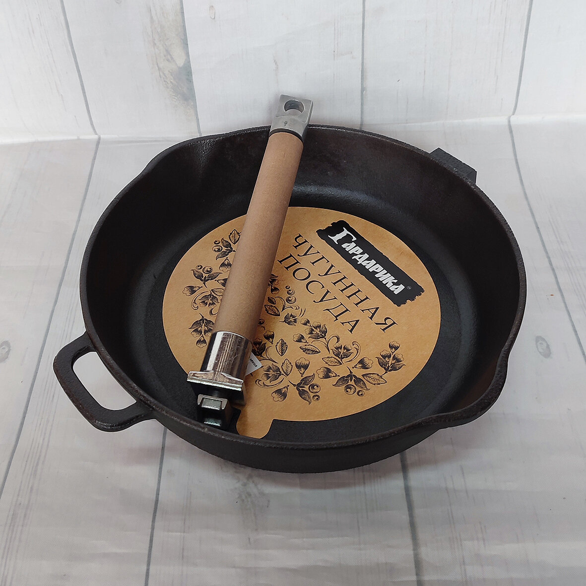 Купить Сковорода чугунная со съемной деревянной ручкой и двумя сливами 24см Гардарика 0224