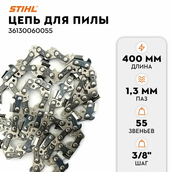 Купить Цепь STIHL для пилы, длина 16 дюймов, шаг 3/8 дюйма, ширина паза 1,3 мм, 55 звеньев