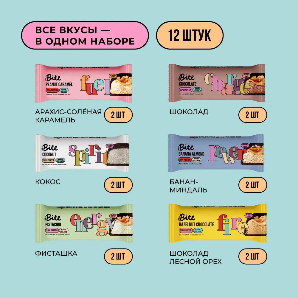 Протеиновые батончики без сахара Take a Bite, ассорти из 6 вкусов, 6 шт по 50 гр