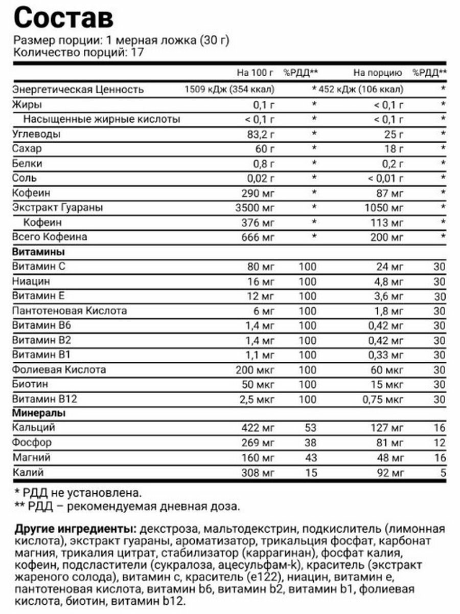 | Основные ингредиенты | витамины и минералы / кофеин / таурин / экстракт гуараны |