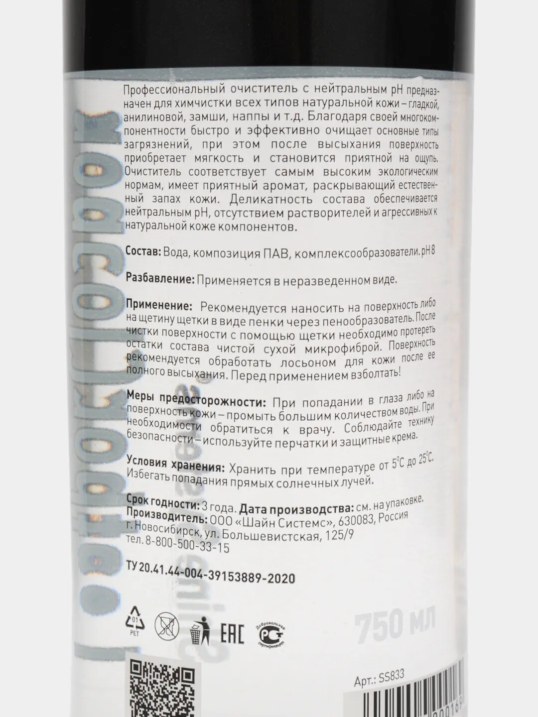 | Дополнительная информация | Профессиональный очиститель кожи Leather Cleaner от Shine Systems предназначен для ухода за салоном автомобиля. Он эффективно очищает все типы натуральной кожи, включая гладкую, анилиновую, замшу, наппу и другие. |