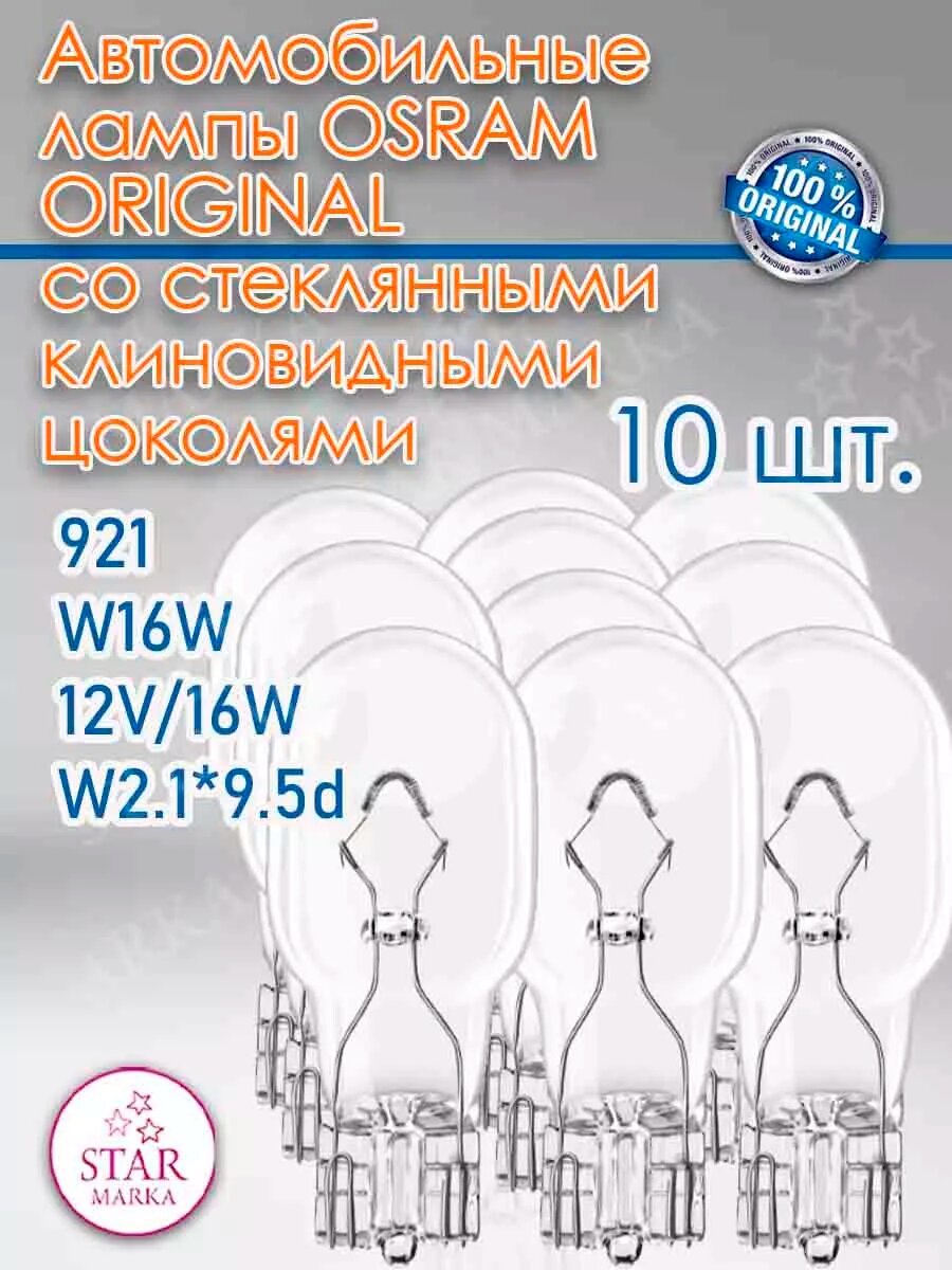 Лампа накаливания 10шт в упаковке W16W 12V 16W W2.1X9.5D (упаковка 10 шт.), OSRAM 921