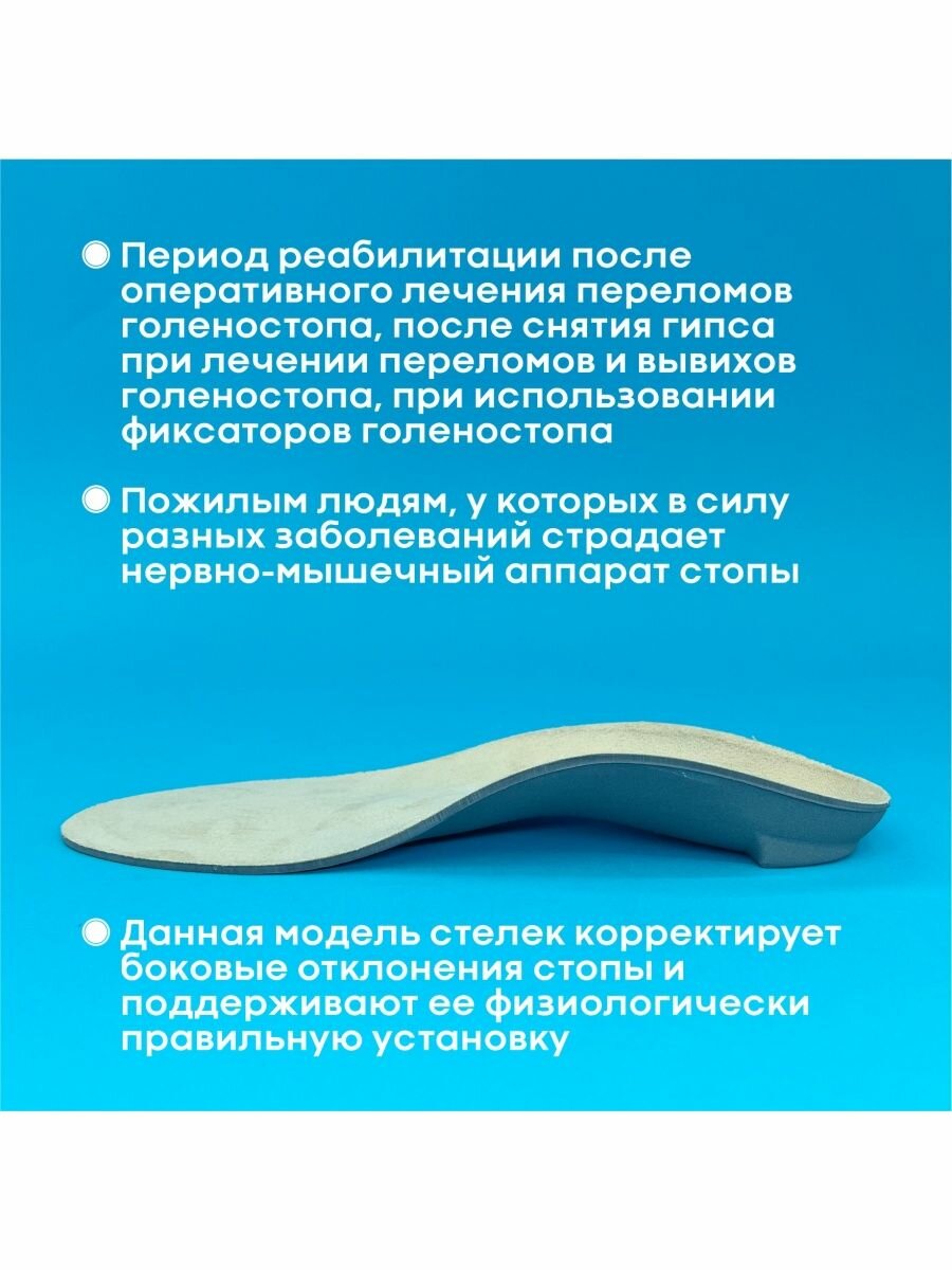 | Показания | артрит/артроз / беременность / вальгусная деформация / варикоз / варусная деформация / деформация нижних конечностей / дисплазия соединительной ткани / искривление позвоночника / лишний вес / натоптыши / повышенная нагрузка на ноги / поперечное плоскостопие / продольно-поперечное плоскостопие / продольное плоскостопие |
