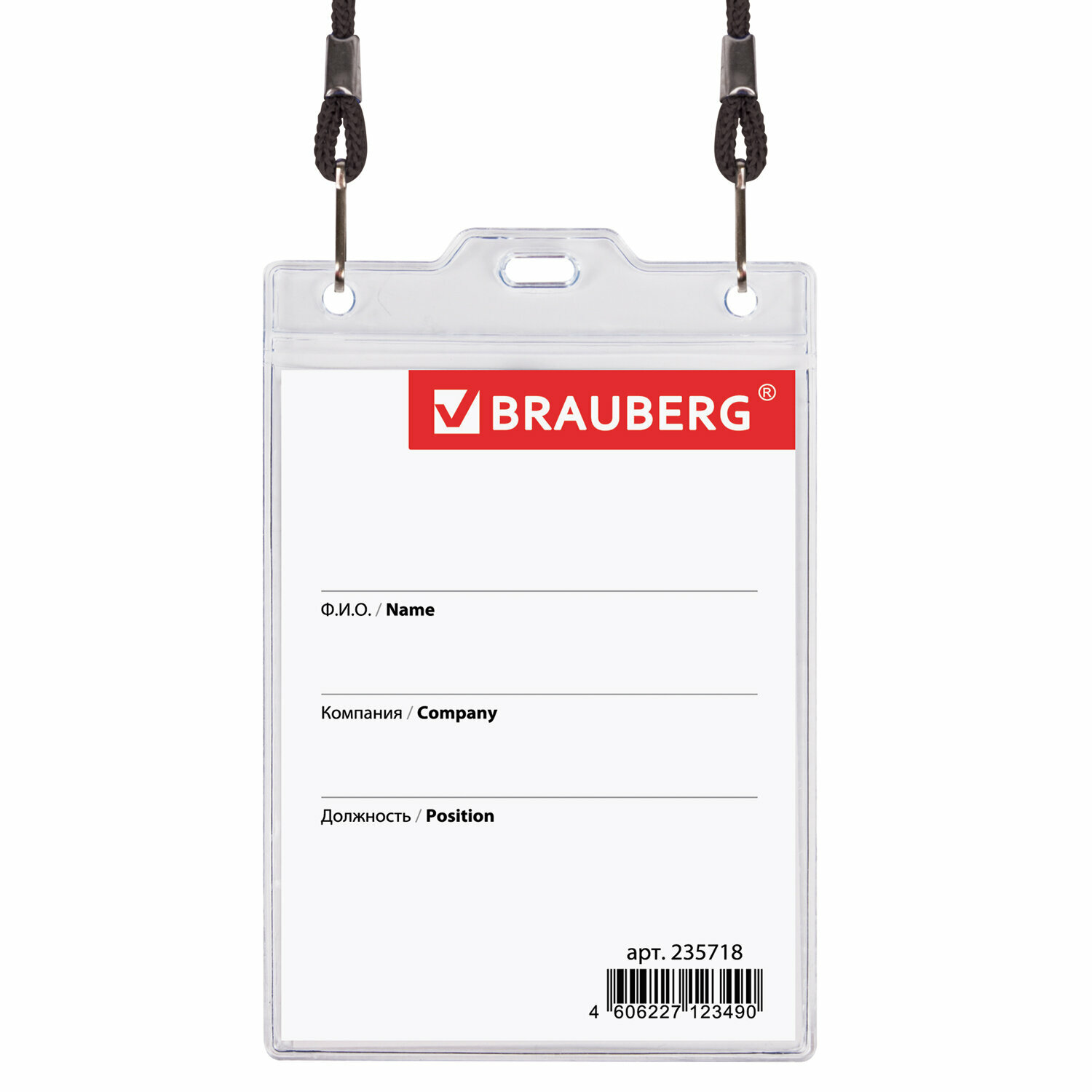 Бейдж вертикальный большой (120х90 мм), на черном шнурке 45 см, 2 карабина, BRAUBERG, 235718