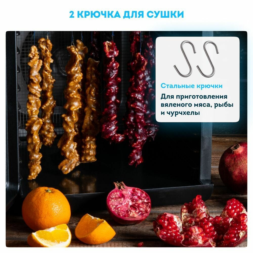 | Плюсы: | Купила летом 2021 года, сушила вишню абрикосы, очень понравилось. Загрузить можно очень много. Искала сушилку с металлическими полками, и огромный плюс в комплекте есть пластиковые сеточки которые кладутся на полки и ничего не прилепает во время сушки. Так же есть пластиковые поддоны. Выглядит стильно, надёжно. Управление удобное. Покупкой довольна. Купила за 15000 по акции. В комплекте есть металлические крючки, я так поняла это подарок от продавца, спасибо |