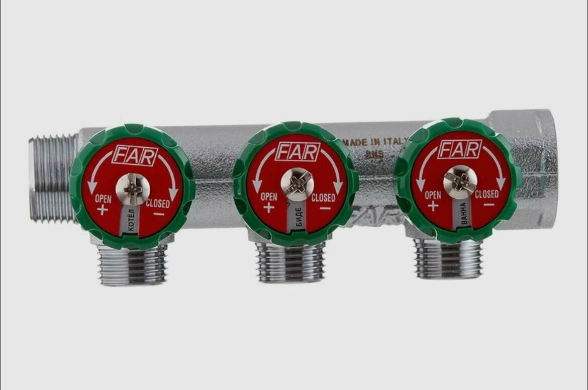 Коллектор FAR 1"х3/4" 3 выхода под плоскую прокладку хромированный с вентилями