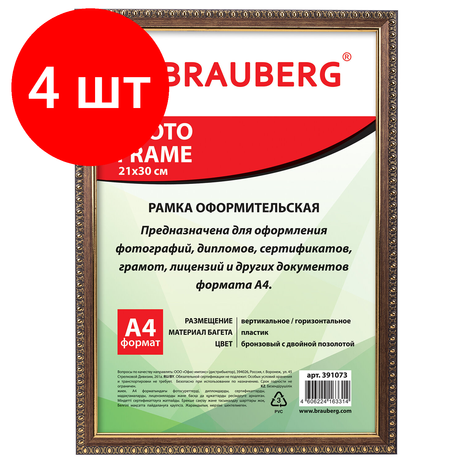 Купить Рамка оформительская Brauberg 21х30 см, пластик, багет 16 мм, "HIT5", бронза с двойной позолотой, стекло (391073)