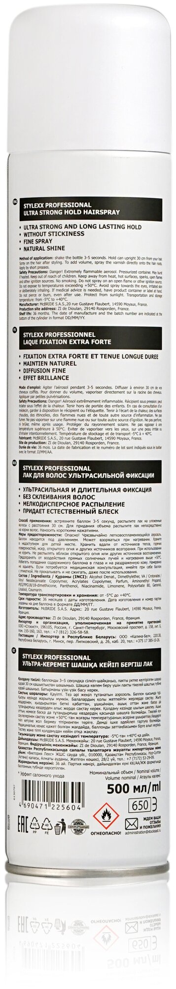Лак для волос Stylexx Professional ультрасильной фиксации, 500 мл.