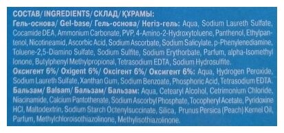 | Комплектация | - флакон с гель-основой, 50 мл; - саше-пакет с оксигентом 6%, 2х25 мл; - саше-пакет с бальзамом "Интенсивный уход", 15 мл; - перчатки; - инструкция по применению. |