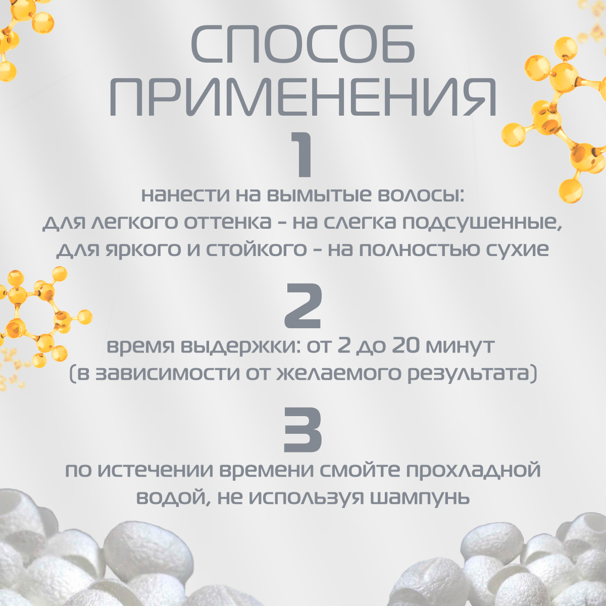 | Способ применения | перед окрашиванием рекомендуется предварительно осветлить волосы при помощи крем-блонда или осветляющего порошка. Не требует применения окислителя или активатора. В зависимости от желаемого результата нанести состав на вымытые и слегка подсушенные (даст более прозрачный и менее стойкий цвет) или полностью высушенные волосы (максимальной яркий и стойкий цвет). Время выдержки составляет от 2 до 20 минут в зависимости от желаемого результата.По истечении времени воздействия смойте прохладной водой. Не используйте шампунь. При желании получить пастельные и прозрачные нюансы рекомендуется разводить с базовым бальзамом или маской. Не желательно попадание на кожу головы |