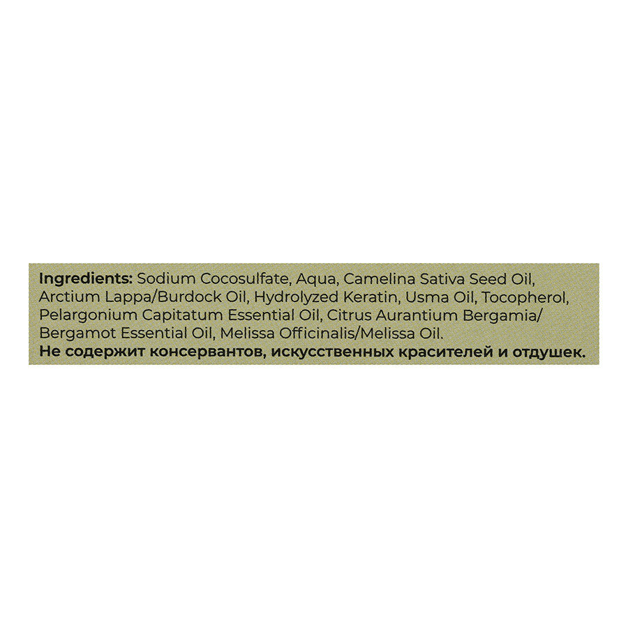 | Состав | - кокосульфат натрия (Sodium Cocosulfate) - питьевая вода (Water) - масло рыжика (Camelina Sativa Seed Oil) - репейное масло (Arctium Lappa/Burdock Oil) - кератин (Hydrolyzed Keratin) - масляный экстракт вайды красильной - масло усьмы (Usma Oil) - витамин Е (Tocopherol) - эфирные масла герани, бергамота, мелиссы (Pelargonium Capitatum Essential Oil, Citrus Aurantium Bergamia/Bergamot Essential Oil, Melissa Officinalis/Melissa Oil) |