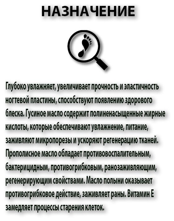 | Дополнительное действие | восстановление, питание, противовоспалительное действие, противогрибковое действие, увлажнение, укрепление ногтей |